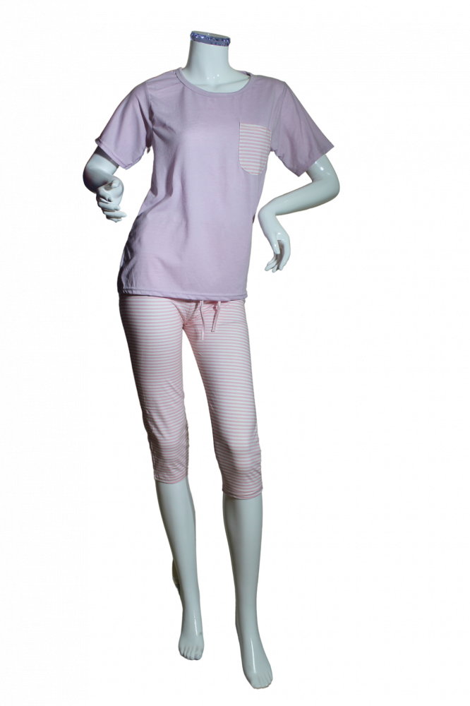 طقم بيجامة بألوان مميزة بلوزة بأكمام قصيرة ومخبى علوي وياقة مستديرة وسروال قصير تحت الركبة بخيط عند الخصر