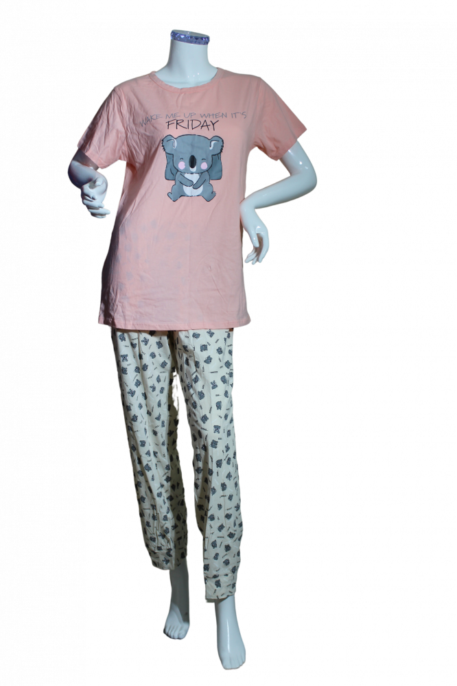 طقم بيجامة بطبعة و بألوان مميزة بلوزة بأكمام قصيرة وياقة مستديرة وسروال طويل بنهاية ضيقة